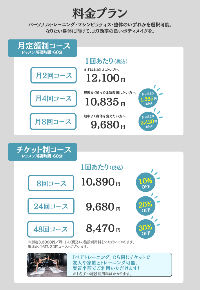 初心者様でも安心して続けられるようなプランをご用意しております。24hジムと併用される方なども多くいらっしゃりますので、どんなお客様でもフィットするプランがございます。